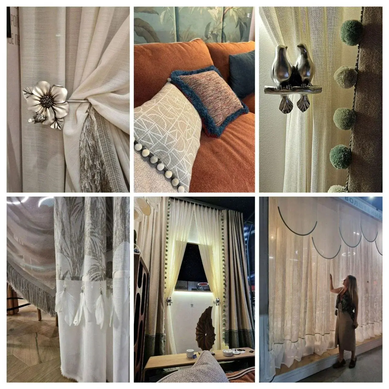 Нами было изготовлено 5-ти метровое оформление-занавес на электрокарнизе, который управлялся через систему Умный дом. И полупрозрачные белые панельные шторы с радиальным полукругом - парящие облачка. Второй сюжет- это текстильное оформление возле диванной зоны. Которое олицетворяло мягкость, тепло и свет дома сквозь сетчатую структуру ткани в сочетании с тактильностью плотных шерстяных штор В оформлении применялись декоративные элементы: пёрышки, жемчуг, подхваты для штор в форме птиц и цветов из состаренной позолоты, шелковистая длинная кисея и помпоны. Добавили уюта декоративные подушки.